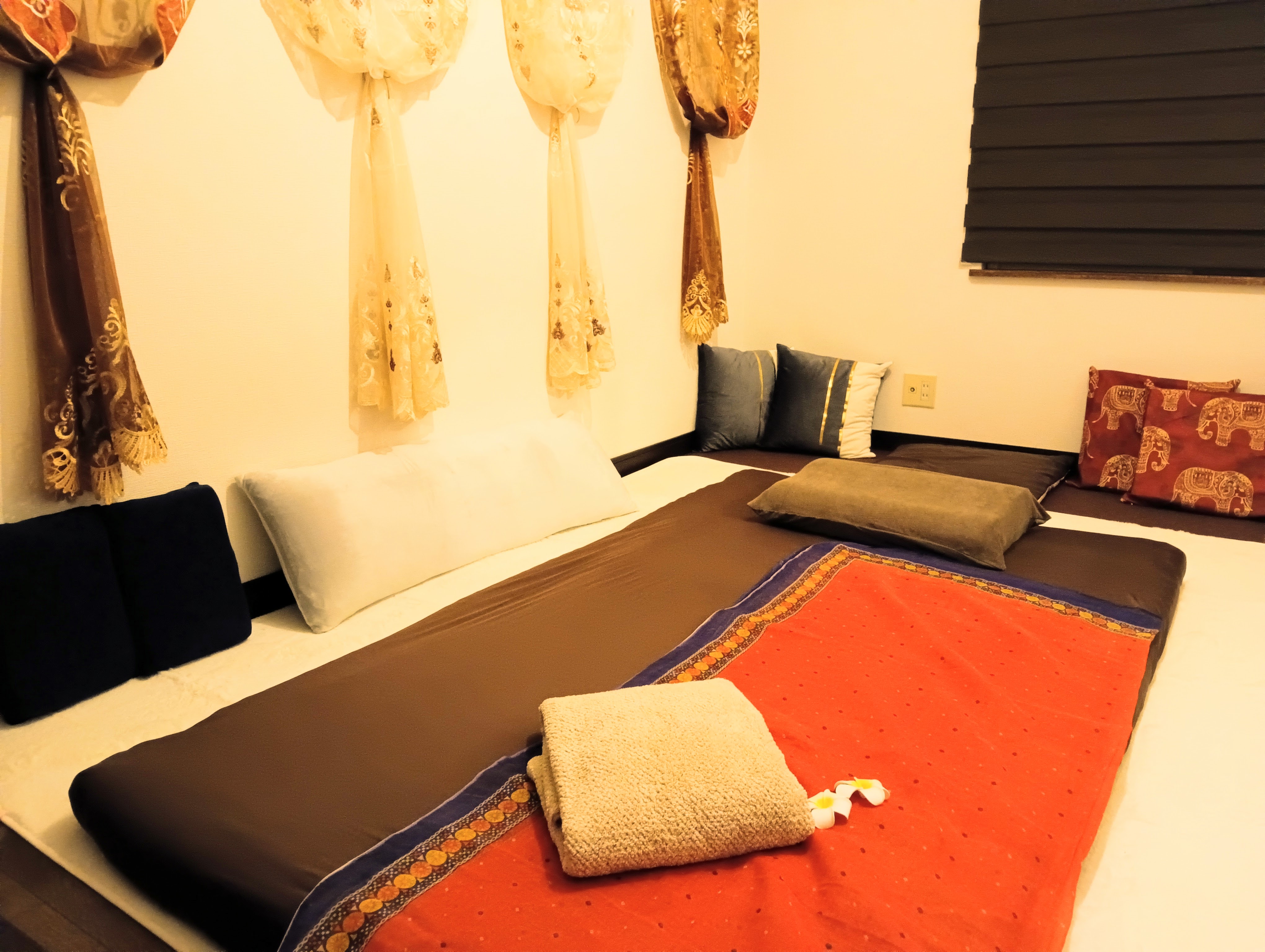タイ古式は床にマット、オイルはベッドでの施術です。小さな水のせせらぐ音、明るさを抑え眠りを誘う店内。